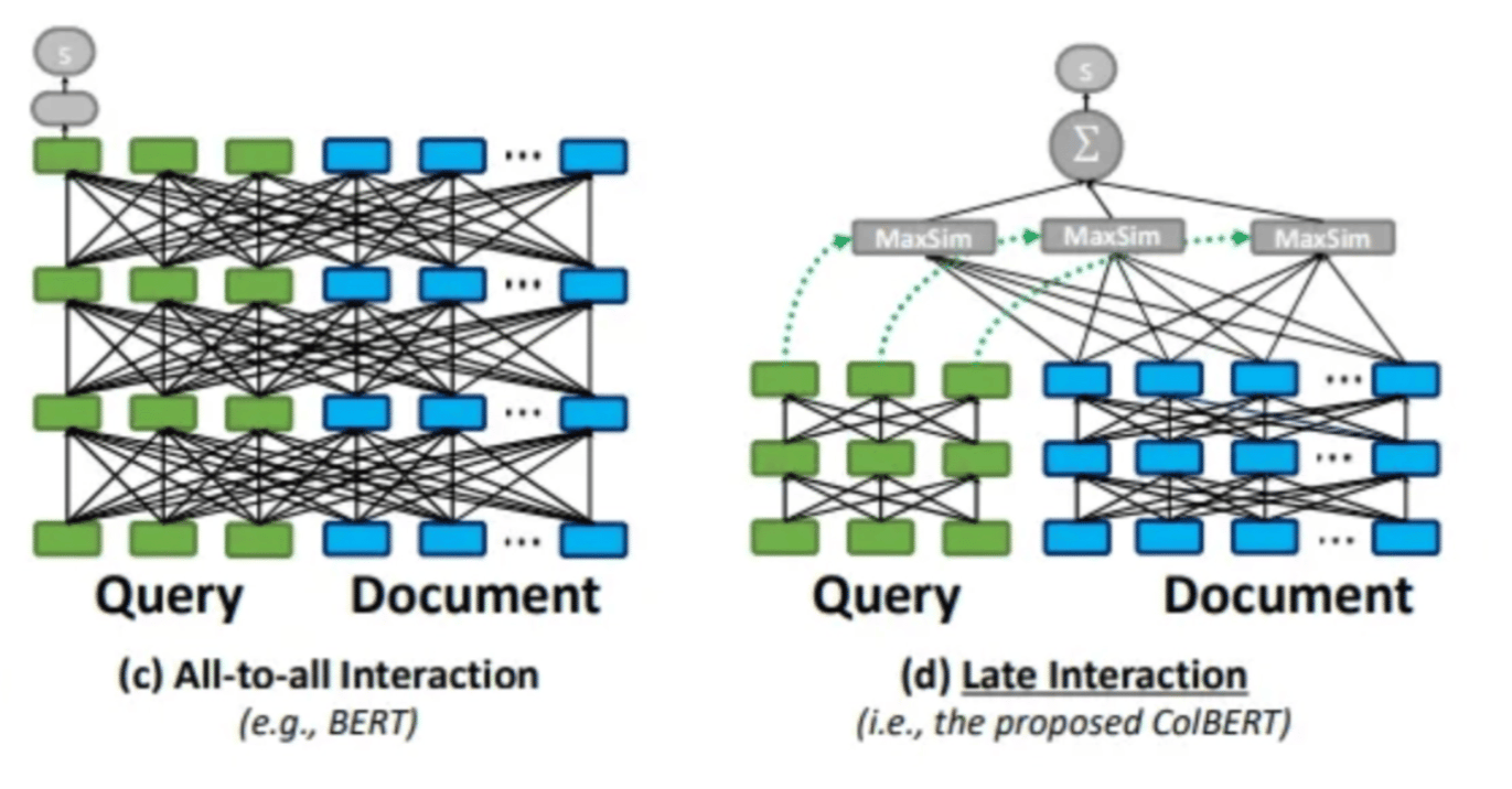 Both try to capture semantics, but the all-to-all “together” architecture wastes a lot of time on interactions that don’t matter much. At every layer, every query token might have a relationship with a document token. But if we enforce that interaction at the very end, we let the final query and document token embedding find their soul mate (see MaxSim below). We can then then we trim the model considerably.